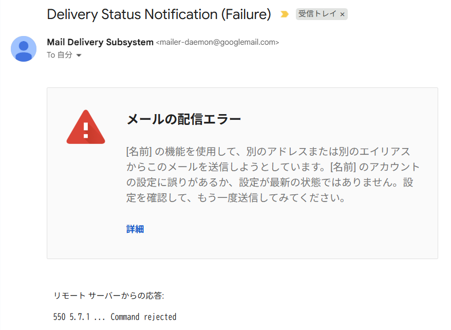 [名前] の機能を使用して、別のアドレスまたは別のエイリアスからこのメールを送信しようとしています。[名前] のアカウントの設定に誤りがあるか、設定が最新の状態ではありません。設定を確認して、もう一度送信してみてくださいん